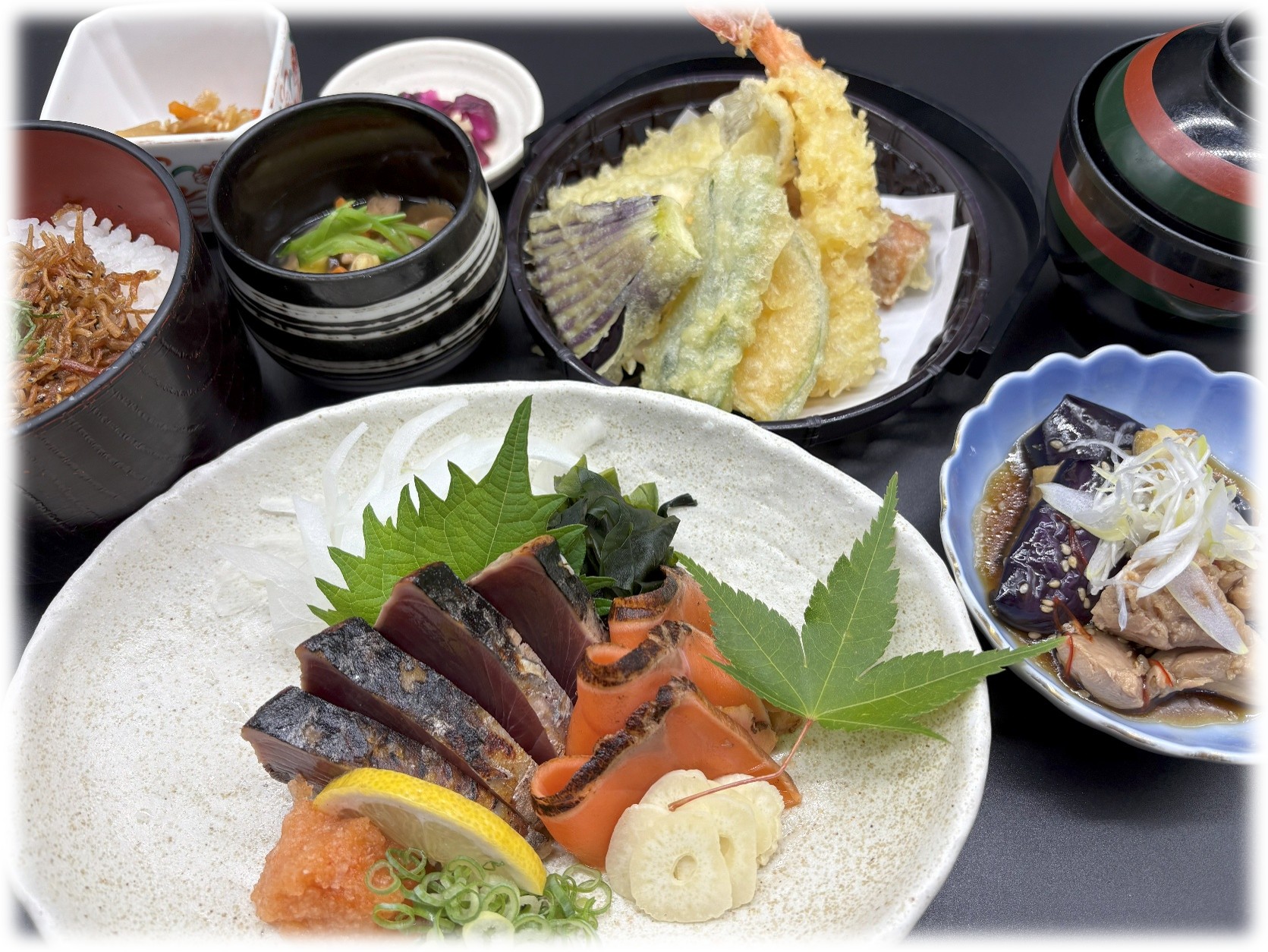 たたき2種・天麩羅・ちりめん山椒御飯・煮物・蒸し物・小鉢・香物・味噌汁